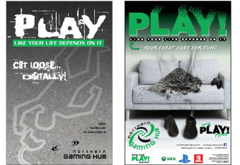 Wherein our interepid hero sets out to redevelop the Northern Gaming Hub logo. In true Hero’s Journey fashion, he attempts the easiest solution first, only to find it most unsatisfactory. Undaunted, he redoubles his efforts and sets out in earnest, crafting a solution he’s initially quite excited about. Throwing this new logo on an old poster, he realizes that the task at hand has a longer road ahead than he realized.